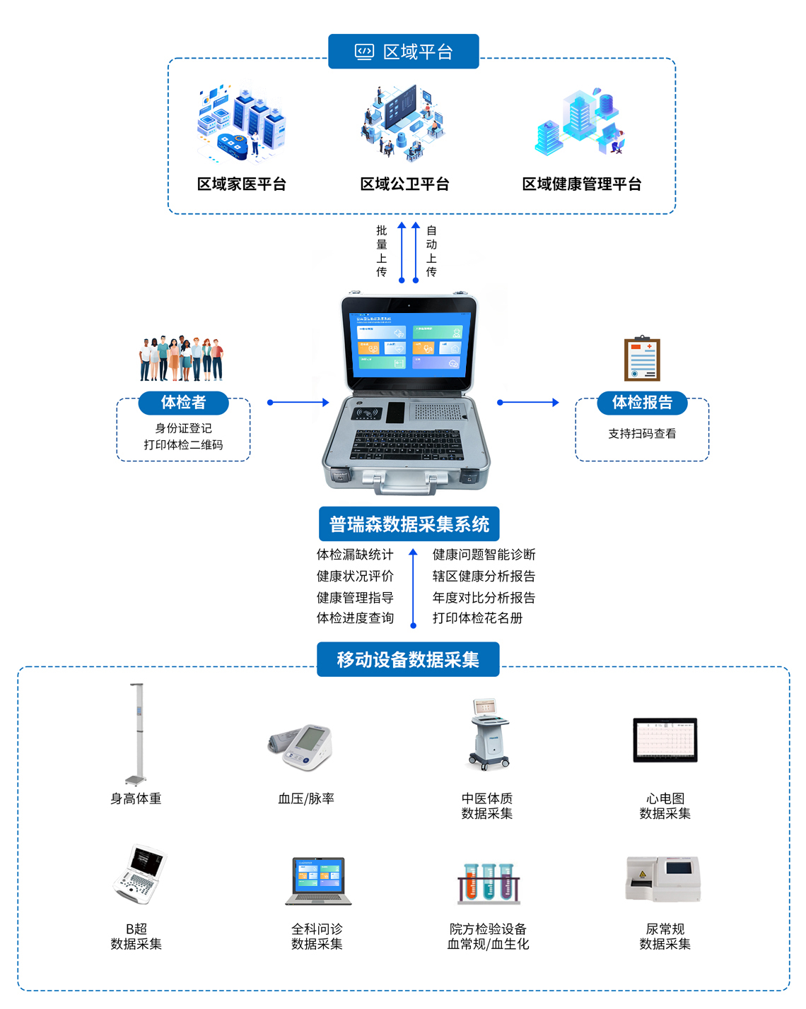 該系統(tǒng)按照縣、鄉(xiāng)、村三級應(yīng)用設(shè)計,以便捷式應(yīng)用、智能化應(yīng)用、多場景應(yīng)用為導(dǎo)向,按照滿足院內(nèi)專業(yè)體檢、下鄉(xiāng)便攜式體檢、移動體檢車體檢及區(qū)域化融合體檢等多種模式搭建,為基層醫(yī)療機構(gòu)公共衛(wèi)生信息化最后一公里提供一站式解決方案,實現(xiàn)國家“讓數(shù)據(jù)多跑路,百姓少跑腿”的相關(guān)要求。