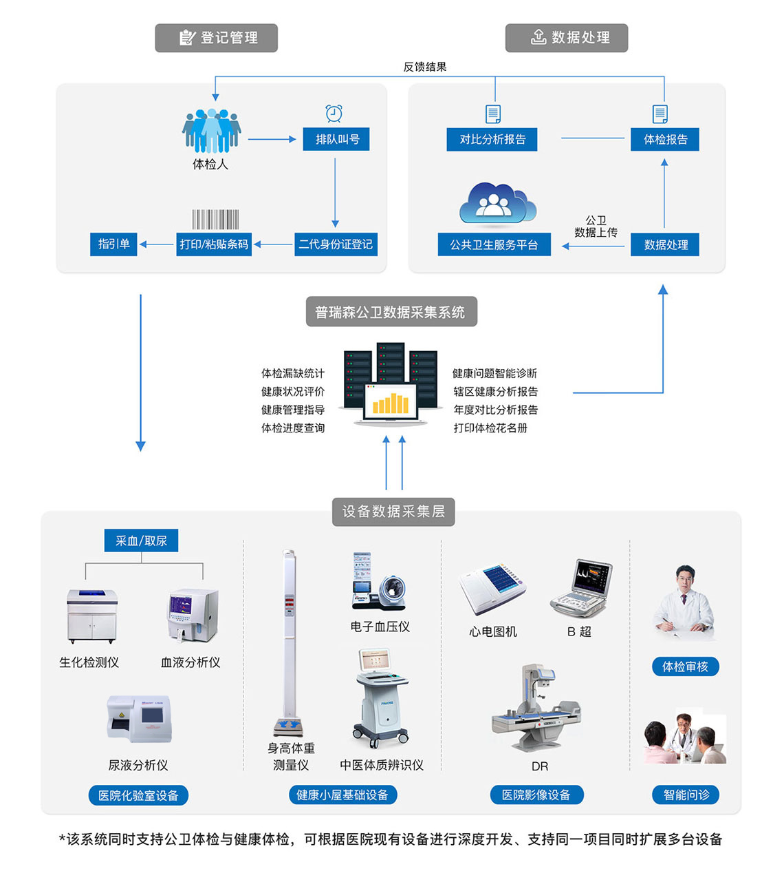普瑞森公共衛(wèi)生數(shù)據(jù)智能采集系統(tǒng)院內(nèi)專業(yè)體檢方案,是在基層醫(yī)療機構(gòu)搭建一套適用于公衛(wèi)體檢、健康體檢、健康教育、健康管理為一體的健康管理中心,深度集成公共衛(wèi)生體檢基礎(chǔ)設(shè)備,無縫鏈接醫(yī)療機構(gòu)現(xiàn)有的心電設(shè)備、超聲檢查設(shè)備、化驗室設(shè)備,結(jié)合內(nèi)科、外科、中醫(yī)科等科室專業(yè)問診,實現(xiàn)居民快速建檔,體檢數(shù)據(jù)自動采集,體檢報告自助打印、體檢數(shù)據(jù)自動上傳至當?shù)鼗竟残l(wèi)生服務(wù)平臺的全功能應(yīng)用。