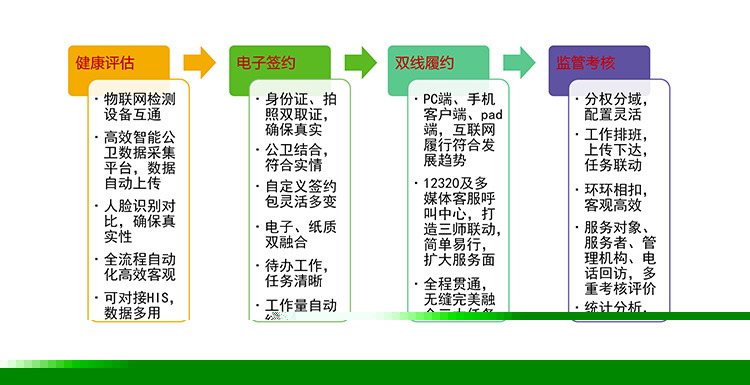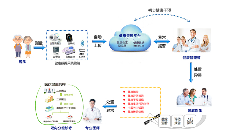 家庭醫(yī)生簽約平臺(tái)是實(shí)施家庭健康管理的服務(wù)平臺(tái),它在社區(qū)范圍內(nèi),以家庭為單位,由社區(qū)衛(wèi)生服務(wù)中心和區(qū)域醫(yī)療衛(wèi)生協(xié)同服務(wù)體系提供支撐,建立居民健康檔案為分級(jí)診療制度建設(shè)逐步形成基層首診、雙向轉(zhuǎn)診、急慢分治、上下聯(lián)動(dòng)的分級(jí)診療和就醫(yī)真正政 策落地模式,全方位的生命體征采集和檢測,線上線下的數(shù)據(jù)干預(yù),為家庭成員提供綜合、連續(xù)、有效的基本衛(wèi)生服務(wù)。