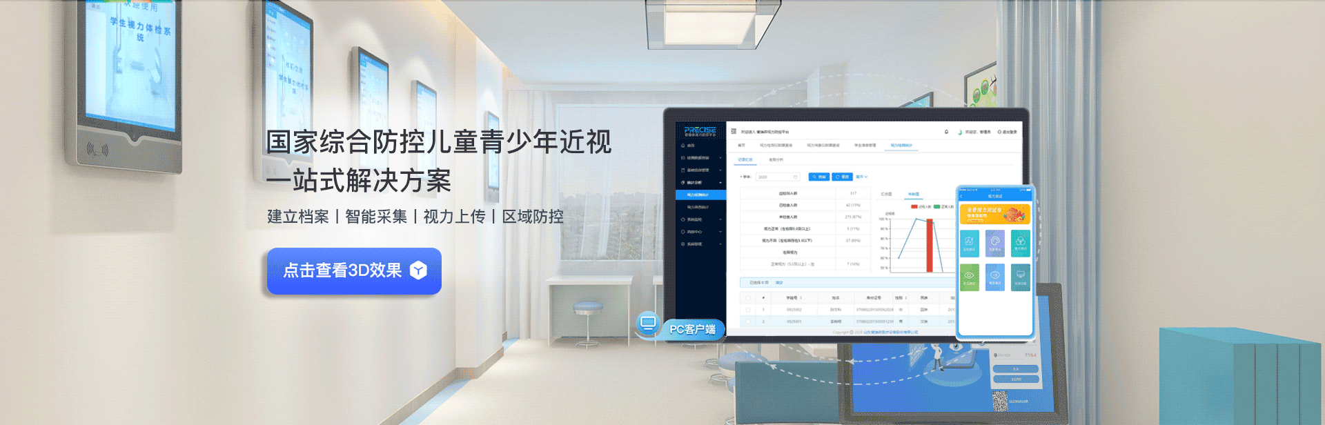 普瑞森青少年視力防控平臺(tái)是運(yùn)用互聯(lián)網(wǎng)、物聯(lián)網(wǎng)和移動(dòng)通信等技術(shù)快速篩查青少年視力并建立健康檔案的系統(tǒng)。由近視防控?cái)?shù)據(jù)管理軟件系統(tǒng)、電子視力檢測(cè)儀、視力篩查儀組成,通過視力檢測(cè)篩查設(shè)備,自助采集匯總數(shù)據(jù)并上傳至云平臺(tái)。支持視力數(shù)據(jù)采集、查詢、統(tǒng)計(jì)、分析、存檔于一體,通過分析體檢者視力發(fā)展趨勢(shì),對(duì)不同視力人群進(jìn)行健康干預(yù)和指導(dǎo)。