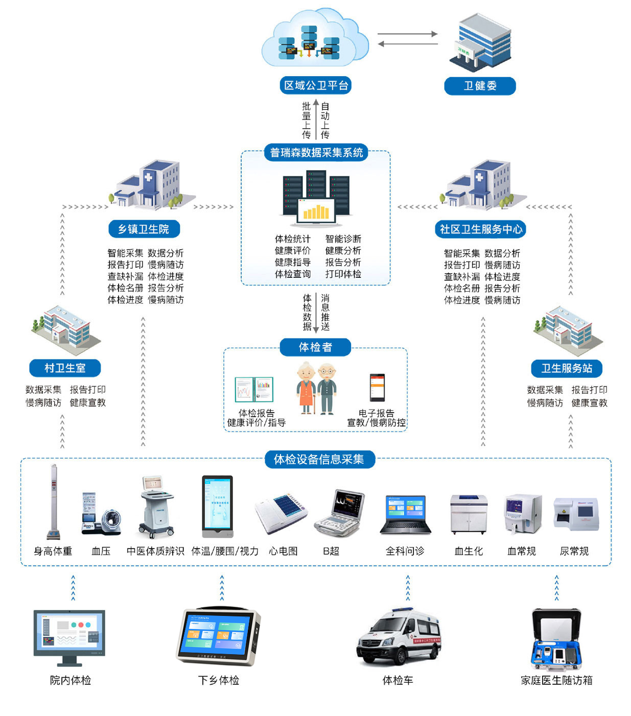 普瑞森公衛(wèi)數(shù)據(jù)智能采集系統(tǒng)一一縣鄉(xiāng)村一體化方案以滿足公衛(wèi)考核為基本要求,充分緩解基層公衛(wèi)人員入手少,任務(wù)重的問題,充分調(diào)動(dòng)鄉(xiāng)鎮(zhèn)衛(wèi)圭院和村衛(wèi)生室的積極作用,通過智能建擋和高效體檢以及健康數(shù)據(jù)實(shí)時(shí)傳輸?shù)葮I(yè)務(wù),為全域居民建立“以健康為中心、以數(shù)據(jù)為依托”的健康服務(wù)體系,利用物聯(lián)網(wǎng)+智能信息化應(yīng)用,建設(shè)統(tǒng)一、規(guī)范、標(biāo)準(zhǔn)的慢病管理中心,提升基層醫(yī)生對慢病患者的服務(wù)質(zhì)量和管理水平。
